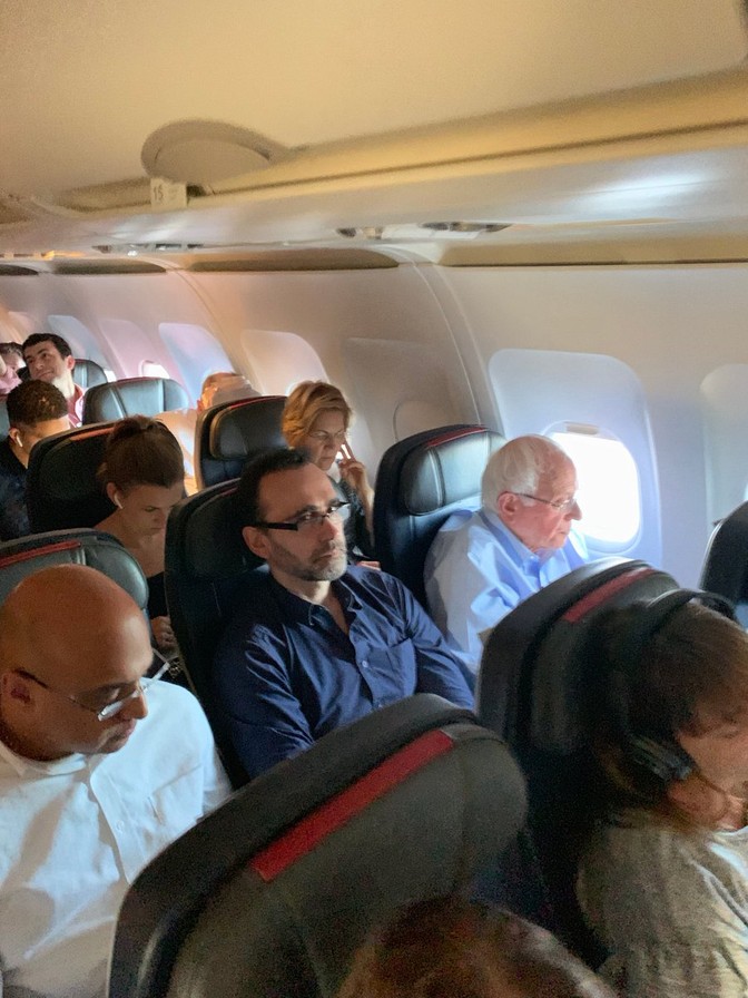 “Off2Miami! @BernieSanders in Seat 15A Thought Bubble: ‘Is she going to kick my chair? I know she’s going to kick my chair! Elizabeth, don’t even think of kicking my chair!’ @ewarren in 16A Thought Bubble: ‘I’m going to kick it the exact moment he thinks I won’t.”