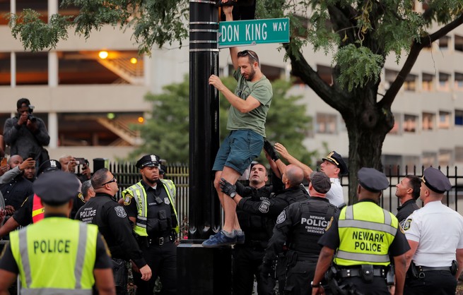 A man climbs a traffic light at a protest over Newark’s lead-in-water crisis, outside the venue of the 2019 MTV Video Music Awards.