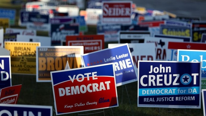 Campaign signs outside a polling station on the last day of early voting in Dallas, Texas, in 2018. (Mike Segar / Reuters)