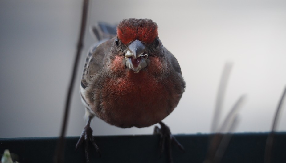 Then, one morning in March, as I brewed coffee in the kitchen, Jeff strode into the office and sprang back out again, announcing he’d seen a flash of red. I joined him, and we peered around the door until the startled visitor worked up the courage to return. A cherry gum ball of a head poked up from the ledge and cocked to one side, uttering an inquisitive chirp and inspecting the room from behind plexiglass. Once satisfied that all was clear, a sparrow-size creature with a blushing breast and triangular beak hopped into the feeder. I recognized it immediately as a house finch.