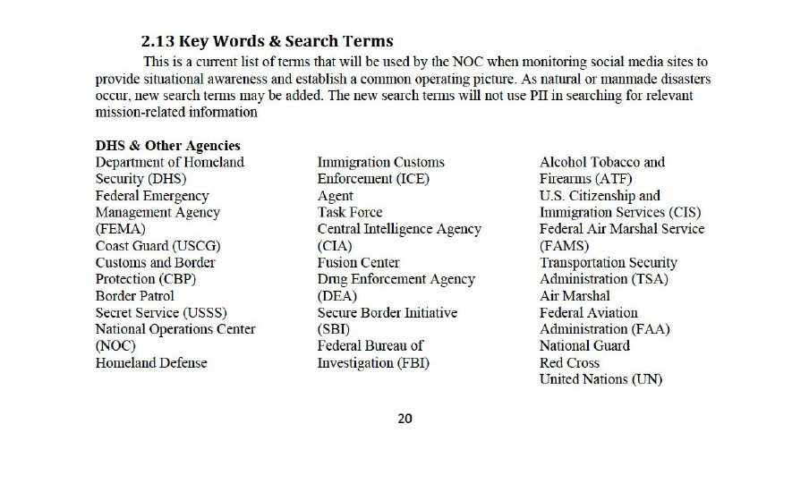 According to a document released by the Department of Homeland Security and posted to Scribd by Huffington Post reporter Andrea Stone, words and phrases ranging from "nuclear" to "ice" are used as search terms by DHS to detect potentially dangerous incidents, such as acts of terrorism, extreme weather, traffic accidents, and hazardous spills. The terms come from a 2011 binder that guides DHS analysts working on the agency's "Media Monitoring Capability Mission" (MMC), DHS's effort to cull clues from open sources -- such as Twitter, media reports, and news stories -- to develop what it calls "situational awareness."