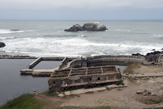Open-air saltwater swimming pools once dotted Scotland's coast along the North Sea. Many have been demolished, at least one turned into a parking lot.  San Francisco had the Sutro Baths, built on a beach inlet in 1896 as the world's largest indoor swimming pool. It was filled with steam-heated Pacific ocean water and enclosed in a huge glass structure. You can still see the concrete imprint of where it once stood.