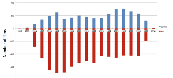 You can browse through the Library's complete database of silent films, which details the 11,000 films made between 1912 and 1929, including the 3,300 that are known to exist. Here's a graph showing films lost (red) versus those that are still around (blue), based on what year they were made: