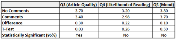 The remaining three questions, however, measured respondent perceptions of the article—and asked for the person's current mood on a five-point scale. The article was the same for all readers, so if comments had no impact, both respondents who saw comments and those who didn't would evaluate the article and their current mood the same way.