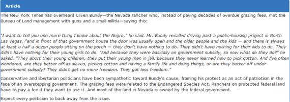 After reading, respondents took a short survey. The first two questions were designed simply to verify they’d read the article. This part was easy. All respondents needed to do was identify that the article was about Cliven Bundy, rather than Donald Sterling, Rush Limbaugh, or Barack Obama.