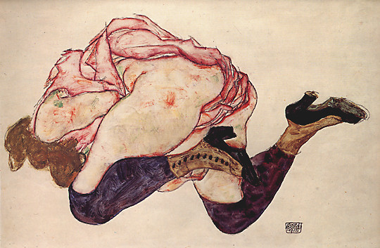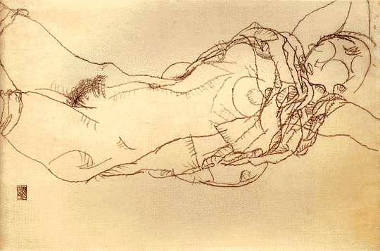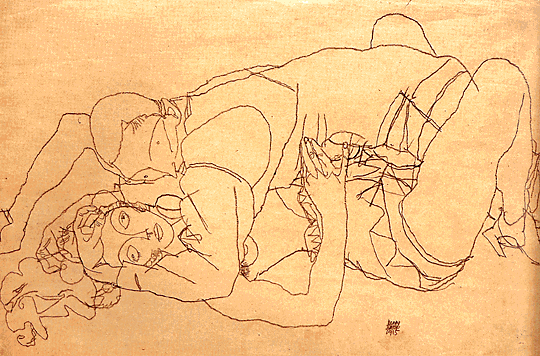 Schama had it right the first time. Though Schiele's pornographic art may be potent in its immediate effect, it is not powerful in its lasting impression. But so obligated did critics feel to appear unfazed before Schiele's anger and vulgarity that not a single one pointed out what was plain to the eye: Schiele, for all his virtuoso touches, had not yet passed out of an awkward artistic apprenticeship. The only persuasive way to judge a work of art is to gauge whether it is true to itself, whether it has achieved what it set out to achieve. Schiele's tortuously cerebral art tends to be disastrously at odds with his erotic intentions. The show's catalogue assertively refers to the art historian Albert Elsen's contention that Schiele used Rodin's technique of "continuous drawing," in which the artist sketches while never taking his eyes off the model. This, critics such as Updike and Schama argued, repeating the idea, accounts for Schiele's visceral spontaneity. Yet look at Rodin's flowing sensuous line in a drawing like Love Asleep (undated) -- as erotic as anything Schiele did -- alongside Schiele's studied angularity, which grows ever more complex and involuted. Schiele could not possibly have achieved such a tangled, cerebral effect through "continuous drawing." Schiele's line, in fact, is fraught with self-reflection. In Reclining Woman with Raised Chemise (1914), or Kneeling Woman with Head Bent Forward (1915), Schiele tied his sensational subjects to the bedframe of self-consciousness. As his career progressed, his line became claustrophobic, strangulating. Consider the study for Act of Love (1915) -- it's as if he were transforming the silent commotion of sexual intercourse into an analysand's monologue. His pictures collapse into the chasm between his divided intentions: he wants to shock and titillate through the depiction of sexuality, but he cannot escape his own tormented self-consciousness about sexuality.