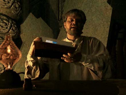 What more could have been done? It seems that the producers not only recognized the need but came close to solving it at the very beginning of the game. Riven opens with the bravura, Hollywood-like gesture of the good wizard Atrus (played in live action by Rand Miller himself) looking up from his desk to find standing before him ... you. He tells you a few things, then gives you two books to aid you in your quest. His appearance is a non-interactive video clip that you merely watch until it's over, but it's a captivating moment nonetheless. After that, however, direct encounter with characters is largely abandoned until the end of the game. And yet in such a fantastical narrative it would have been fairly easy to concoct scenarios in which characters could appear and communicate with the player regularly. Perhaps the producers valued their familiar, eerie mood of "depopulation" more. Or perhaps they worried that characters appearing and speaking to the player might short-circuit the gameplay -- though the entire history of good fiction shows that ongoing contact with characters need not spoil the pleasure of an unfolding plot.