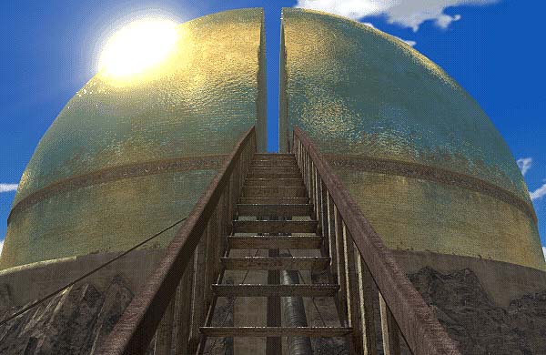 Not surprisingly, no off-the-shelf technology exists for taking interactive narrative and drama and character "to the next level." Myst and Riven present you with landscapes and interiors typically devoid of people altogether. Instead, those places contain the puzzle-laden architecture and inventions of wizard-scientists, and these things can be genuinely revealing of a certain kind of narrative and character. Still, as I've mentioned, old-fashioned text is mostly how you know that a wicked genius named Gehn and his good son Atrus have developed a technology of "linking books" that create literal worlds to which they travel, and that Gehn has been banished from such a world -- Myst Island -- to another one -- Riven -- where he has set himself up as a god and holds Atrus's wife, Catherine, captive.