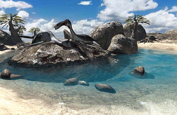 Sunners (some of Riven's fantastical creatures) on a rock near the sea.